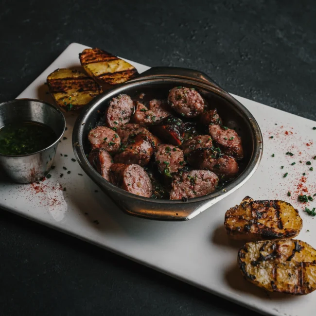 Chorizo criollo a la brasa troceado con patatas al caliu.