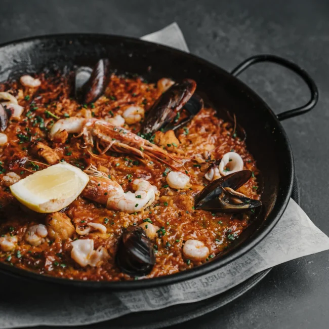 Arroz bomba, mariscos, mejillones, almejas y sepia.