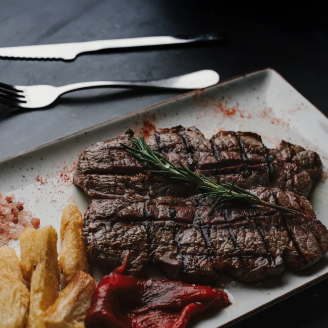 Lomo fresco con aceite de oliva, ajo y perejil con guarnición de patatas.