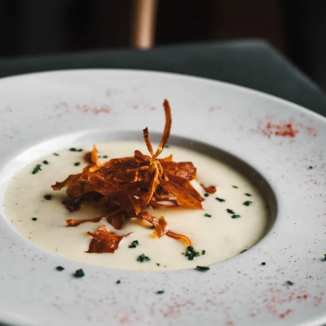 Tentáculos asados, aceite de pimentón y emulsión de patata.