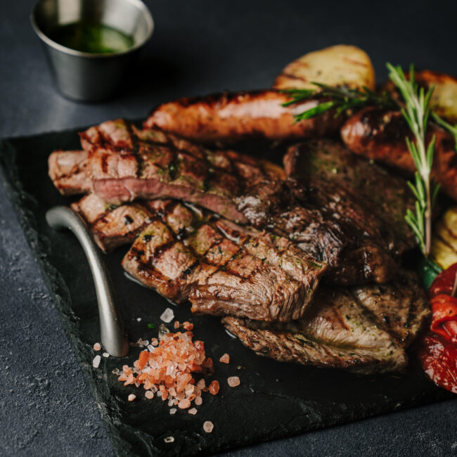 Vacío madurado, secreto ibérico, picaña, chorizo criollo, patatas a la brasa y verduras. Pequeña (2 personas): 45€ Mediana (4 personas): 65€